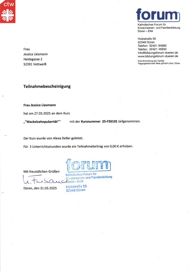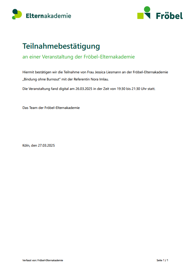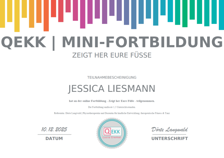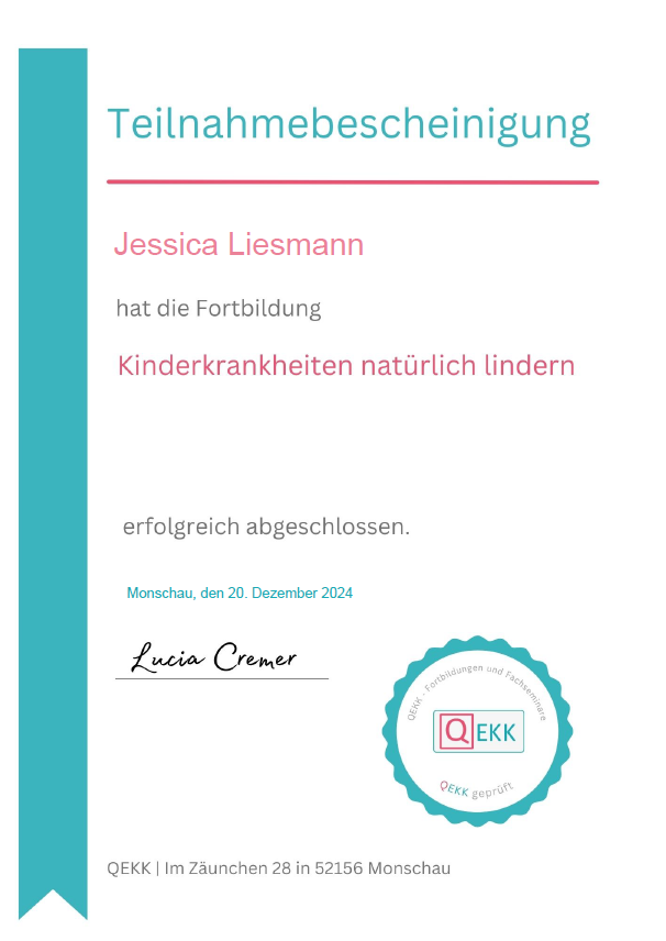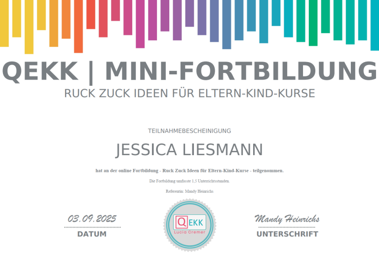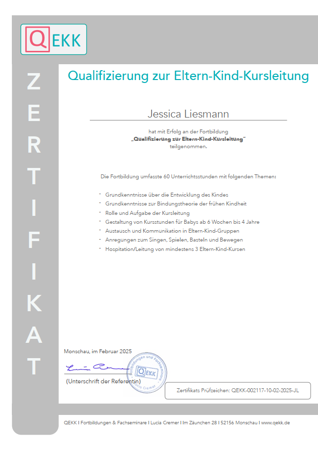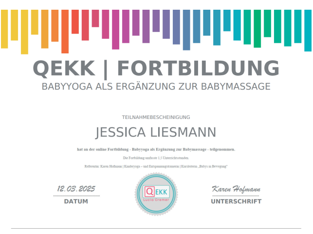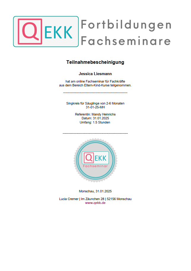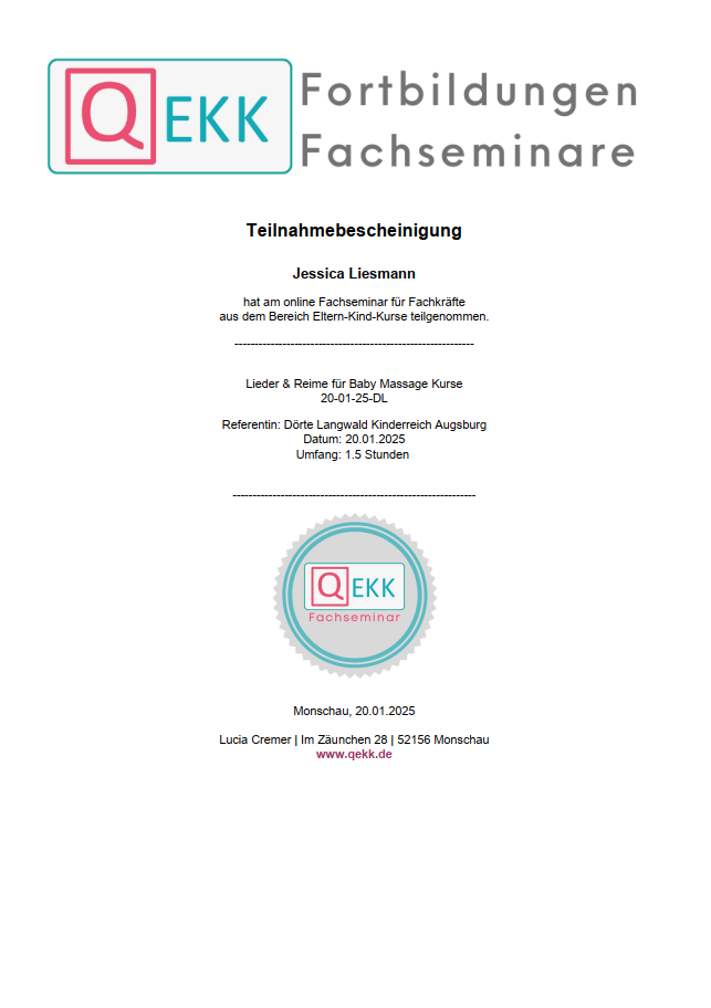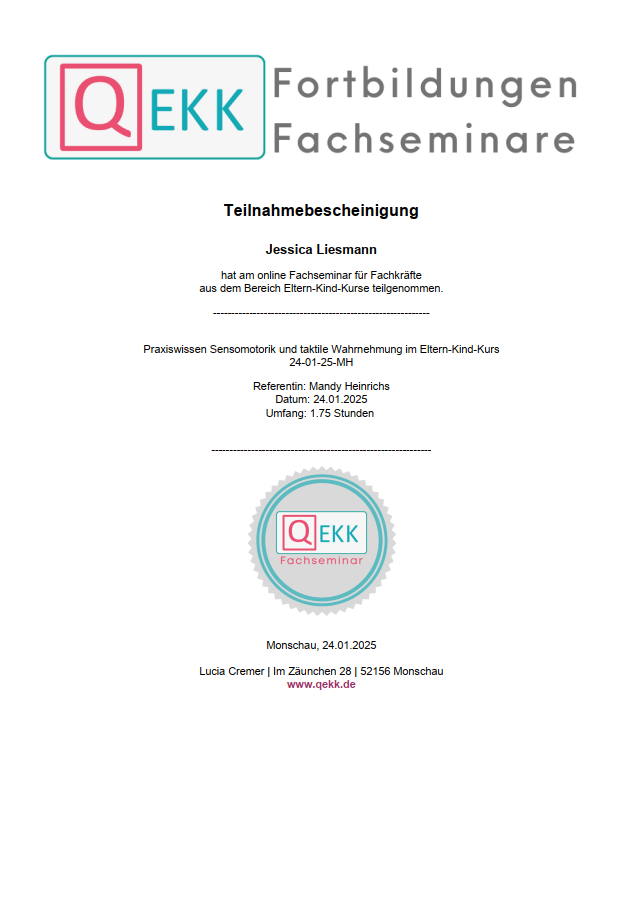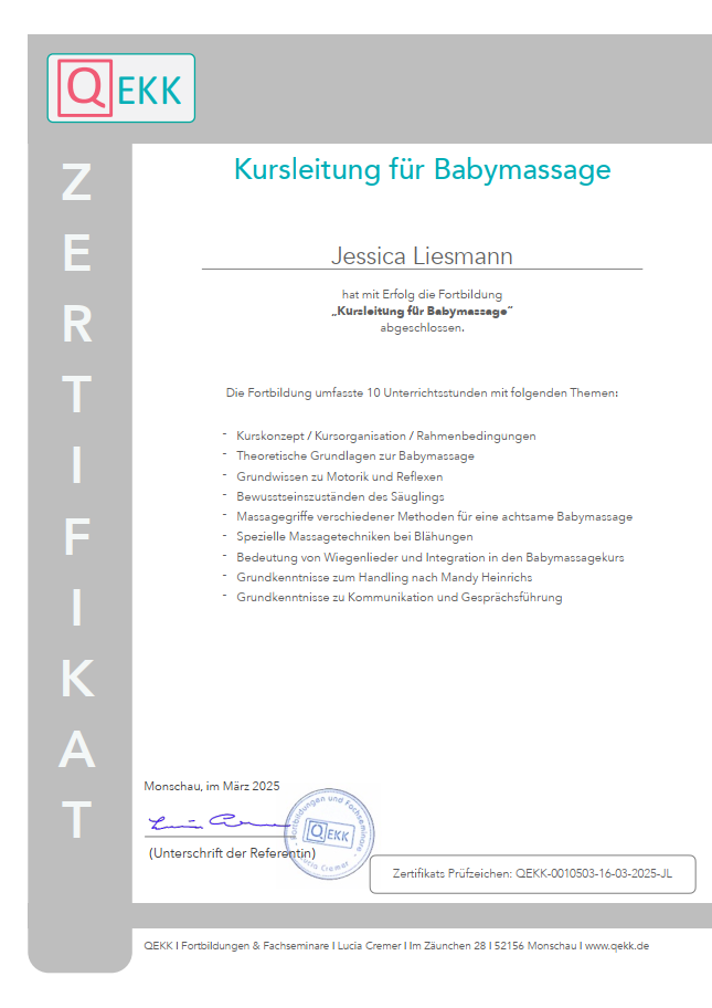 Ich bilde mich kontinuierlich weiter, um Familien bestmöglich zu unterstützen. Dazu besuche ich Fachseminare, nehme an Vorträgen teil und absolviere Fortbildungen bei verschiedenen Anbietern. Zu diesen gehören unter anderem QEKK, das DRK, Familienzentren, die Fröbel Elternakademie sowie kirchliche Gemeinden. Vorliegende Teilnahmebescheinigungen oder Zertifikate stelle ich hier zur Verfügung.